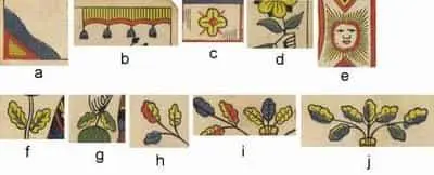 في 10 من تلوين الزهور في الزاوية اليسرى السفلية (قارن a) وفي بطاقة ملك الدرع King of shield ، تغير الركن العلوي الأيمن (قارن b ، حيث يوجد الآن حبل معلق خامس).