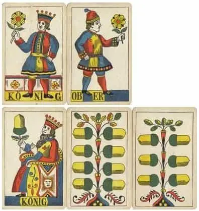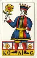 ملك الورد. إن زخرفة الزهرة في الربع السفلي من البطاقة لديها الآن خطوط حمراء سميكة (قطري ومتقاطع ، قارن c). الأوراق على بطاقة أوبر من روز تغيرت من الأخضر / الأزرق إلى الأخضر (قارن د). مضمنة الشمس على عرش الملك أكورن في مساحة مملوءة باللون الأحمر (مقارنة ه). الأوراق على بطاقة أكورن أوبر تغيرت بشكل أساسي من الأصفر إلى الأخضر (قارن f). تغيرت الأوراق الزرقاء على بطاقة 9 من الجوزة من الأزرق إلى الأخضر.